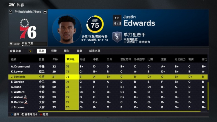 8月30日讯 NBA2K26各队球员能力值出炉,其中76人球员详情能力值如下:恩比德92全队最高;马克西86,乔治81,格莱姆斯和麦凯恩都是80;乌布雷78,埃奇库姆和庄神都是76,洛瑞和爱德华兹都是75,戈登和博纳都是74,沃特福德73。