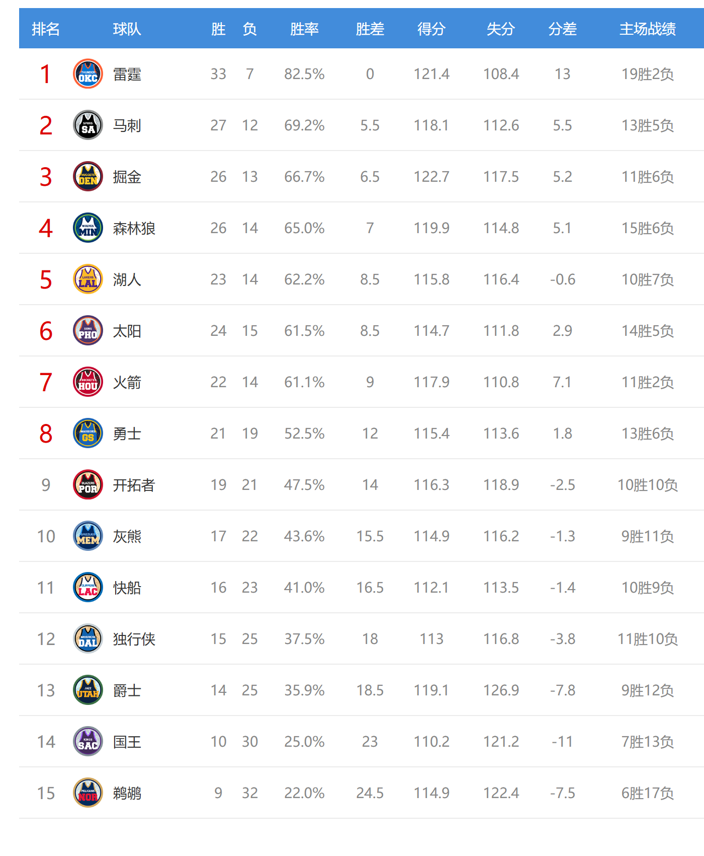 今日比赛后西部排名没有变化,只是球队间的胜场差有所变化,西部最新排名如下: