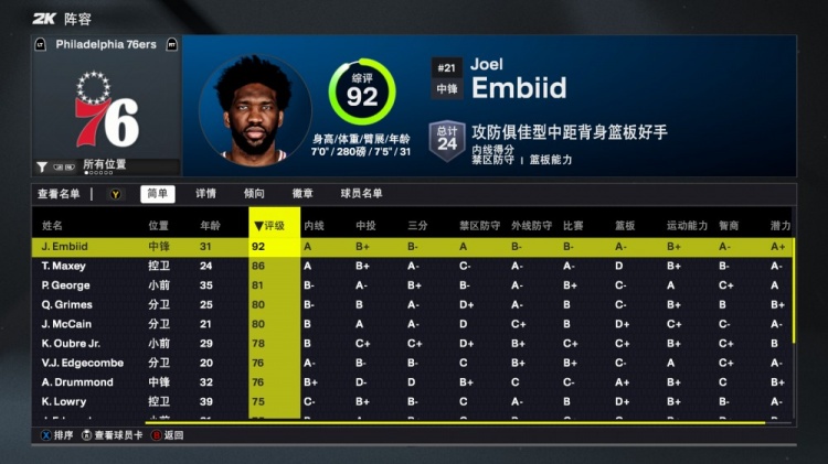 8月30日讯 NBA2K26各队球员能力值出炉,其中76人球员详情能力值如下: